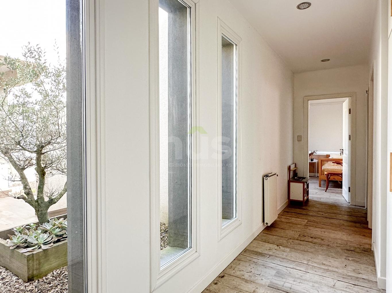Hall de entrada con amplio living-comedor con estufa y ventanales amplios con salida al jardín.